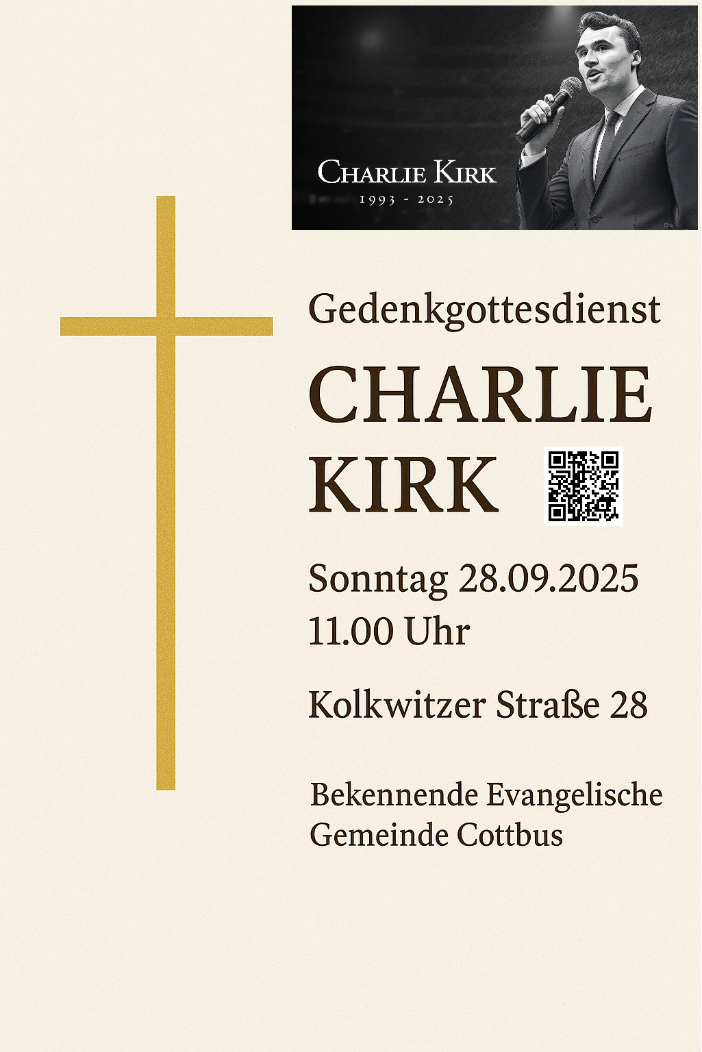 Die Bekennende Evangelische Gemeinde (BEG) Cottbus organisiert am kommenden Sonntag (28.09.2025) in Gedenken an den ermordeten Charlie Kirk einen Gottesdienst. Das gefällt vielen nicht. Die Gemeinde sieht sich mit Dutzenden von Hassmails und einem Shitstorm in den sozialen Medien konfrontiert und beantragte für den Gottesdienst gar Polizeischutz. Trotzdem hält sie an ihrem Vorhaben fest – und bittet um Unterstützung im Gebet. |